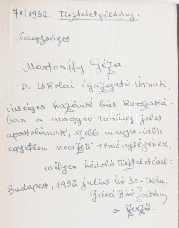 Biró Zoltán, gelsei: Bethlen. Történelmi eposz. (Dedikált!) Dr. Pekár Gyula előszavával. Bp., 1930, Bethlen Történelmi Eposz Kiadó-társaság, 191+(1) p. Egyetlen kiadás. Oldalszámozáson belül egészoldalas, fekete-fehér képekkel. Kiadói aranyozott egészvászon-kötés, nagyrészt jó állapotban, néhány kissé foltos lappal. Az elülső szennylapon a szerző, Gelsei Biró Zoltán (1874-1942) egészoldalas dedikációjával: ,,Tiszteletpéldány. Nagyságos Mártonffy Géza p. iskolai igazgató úrnak, ínséges hazánk bús korszakában a magyar tanügy jeles apostolának, szebb magyar-idők egyetlen nemzeti reménységének, mélyen hódoló tiszteletével [...] a szerző"