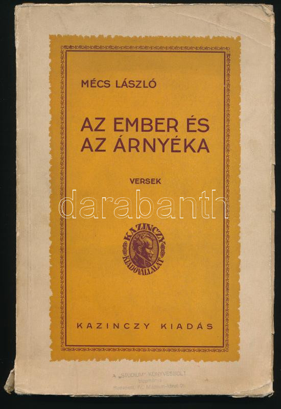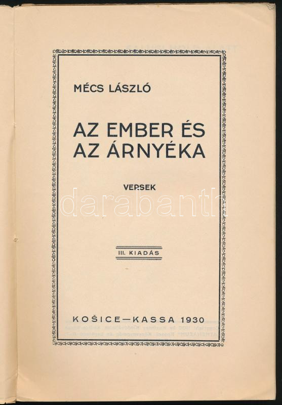 Mécs László: Az ember és az árnyéka. Versek. Kassa, 1930, Kazinczy Kia... https://www.darabanth.com/en/473-Online-auction/473.0/Books/Books-Other-rarities~1000049/Mecs-Laszlo-Az-ember-es-az-arnyeka-Versek-Kassa-1930-Kazinczy-Kiadovallalat-149plus3-p~II3211194