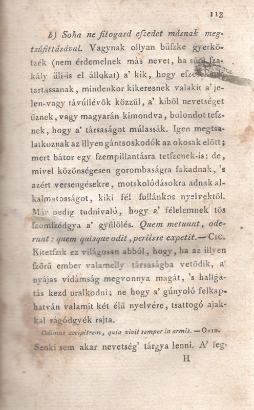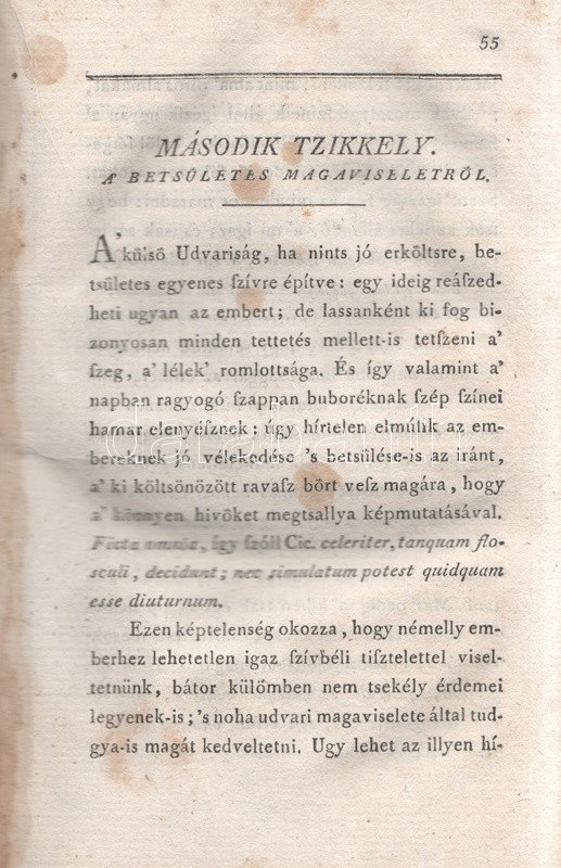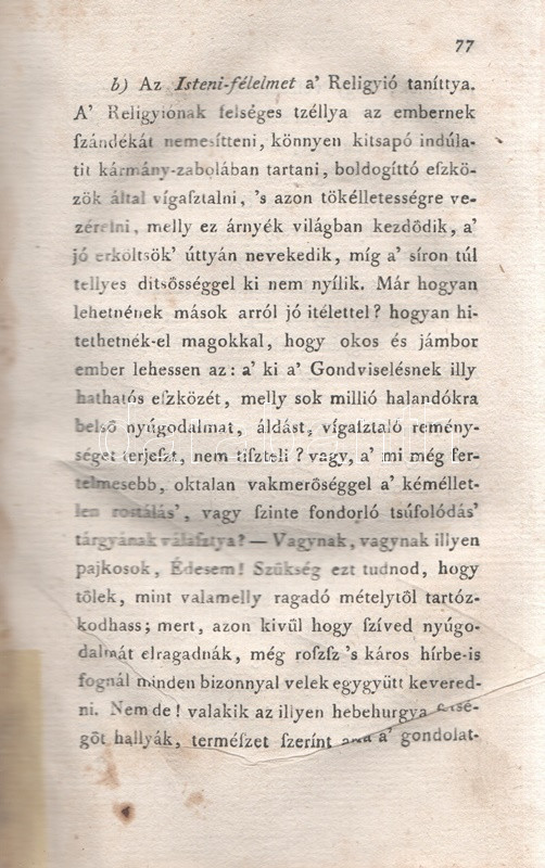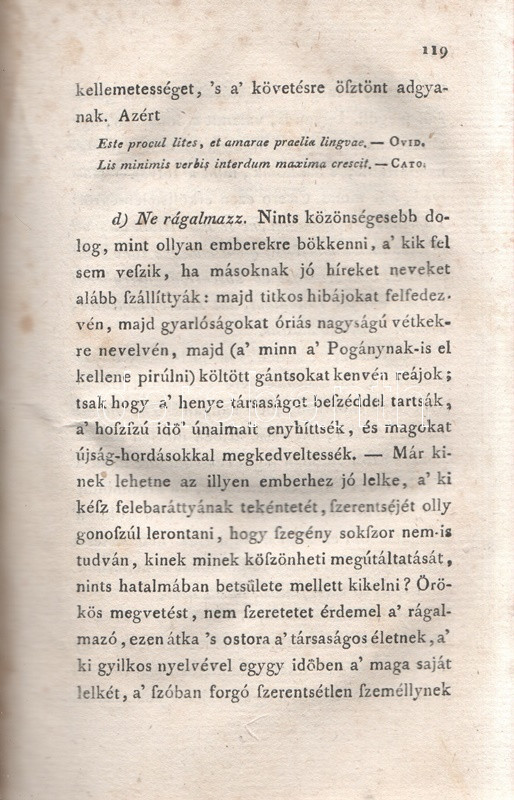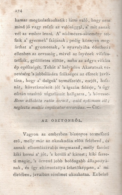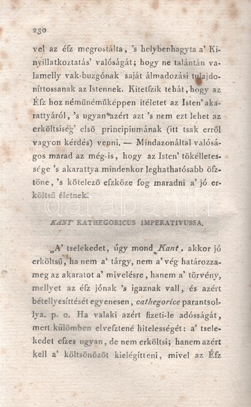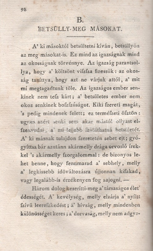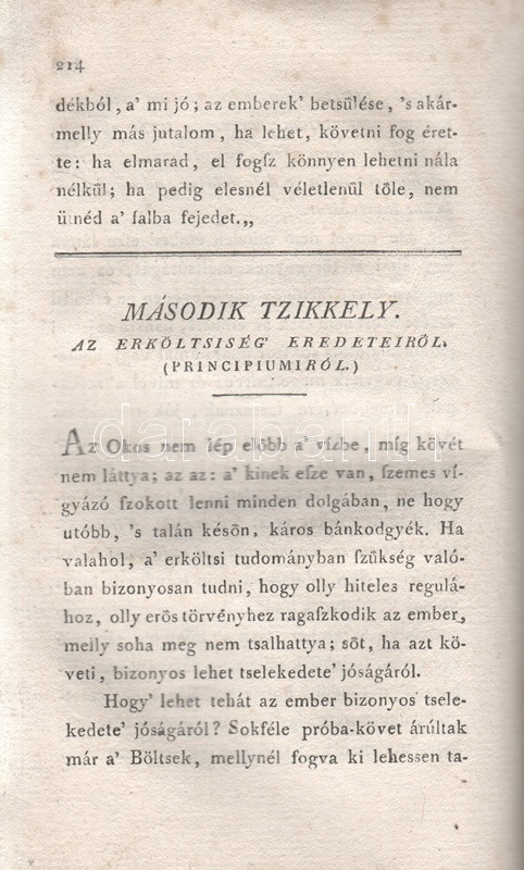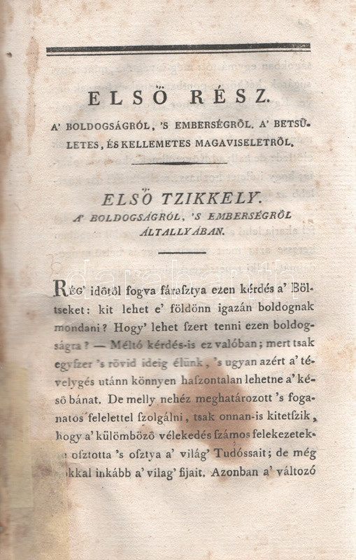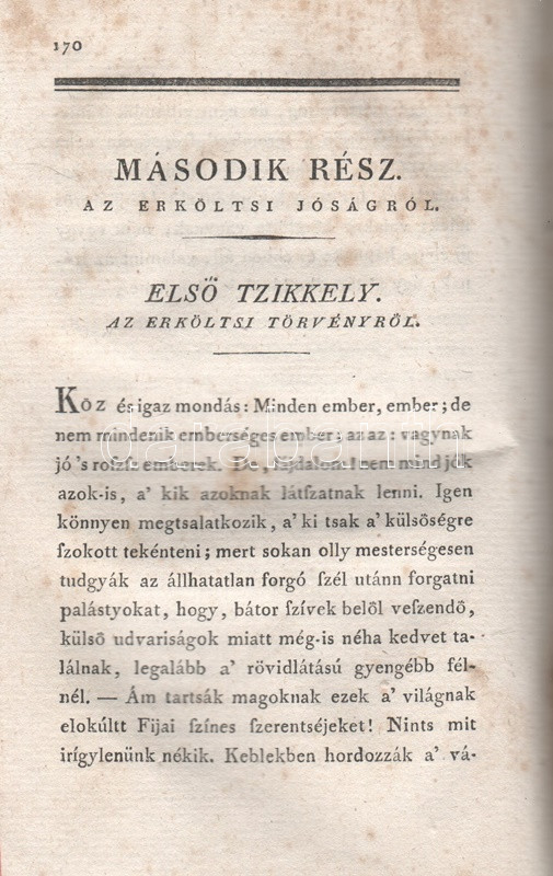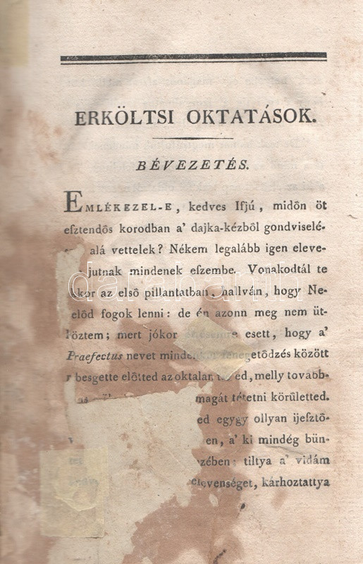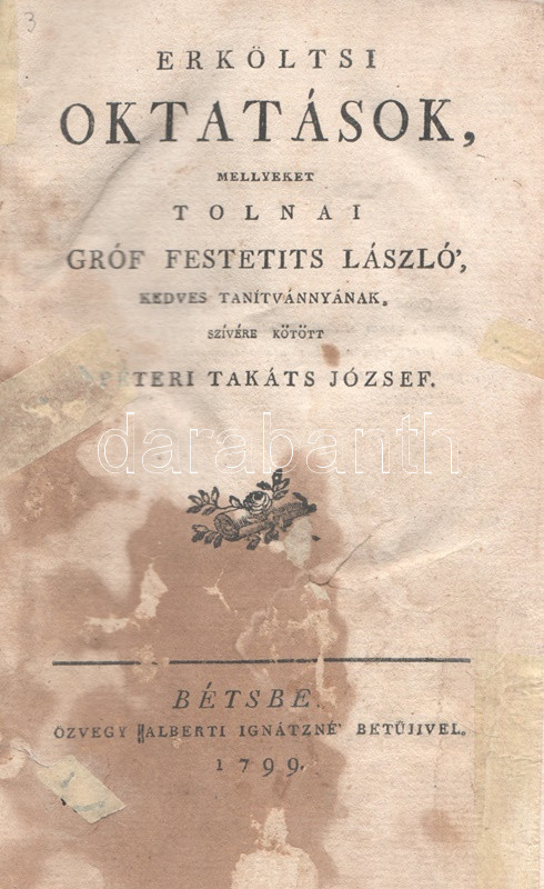 Péteri Takáts József: Erköltsi oktatások, mellyeket tolnai gróf Festetits László', kedves tanítvánnyának szívére kötött Péteri Takáts József. Bétsbe, 1799. Özvegy Alberti Ignátzné' betűjivel. [3]-392 p. Egyetlen kiadás. Péteri Takáts József (1767-1821) dunántúli papnövendék, szerkesztő, kultúraszervező, író, a Festetits család házi tanítója. A magyar felvilágosodás első nemzedékével, nyelvészeivel, költőivel: Révai Miklóssal, Baróti Szabó Dáviddal; Görög Demeterrel, az első magyar hírlap, a bécsi Magyar Hírmondó szerkesztőjével jó kapcsolatot ápoló egykori papnövendék 1797-től tanítványával, Festetits Lászlóval bejárta Magyarországot és Erdélyt. Erkölcsnemesítő könyvecskéje az általa alapított könyvkiadó vállalat, a Magyar Minerva II. kötete, melyet a Festetitsek költségén adott ki. A morálfilozófiai munka sokat értekezik a külső és belső erkölcsiség természetéről, a hazafiasságról, az alázatról, a fegyelemről, az istenfélelemről, a hazaszeretetről; a lélek, az akarat, az ösztönök alkatáról. A klasszikus latin, francia kútfőket idéző munka az elsők egyike, amely a kortárs német filozófus, Immanuel Kant munkásságát is méltatja. Példányunk címlapján, valamint az azt követő hat levélen nagyobb pótlás, a következő kilenc levélen kisebb, a szövegtükröt nem érintő javítás a gerincnél. A belív számos oldala a gerincnél megerősítve. A címlapon és az első ív levelein halvány foltosság, példányunk oldalain kisebb foxing. [Magyar Minerva, II. kötet.] Szüry 4447. XIX. század második feléből származó egészvászon kötésben, vörös festésű lapszélekkel. Jó példány.