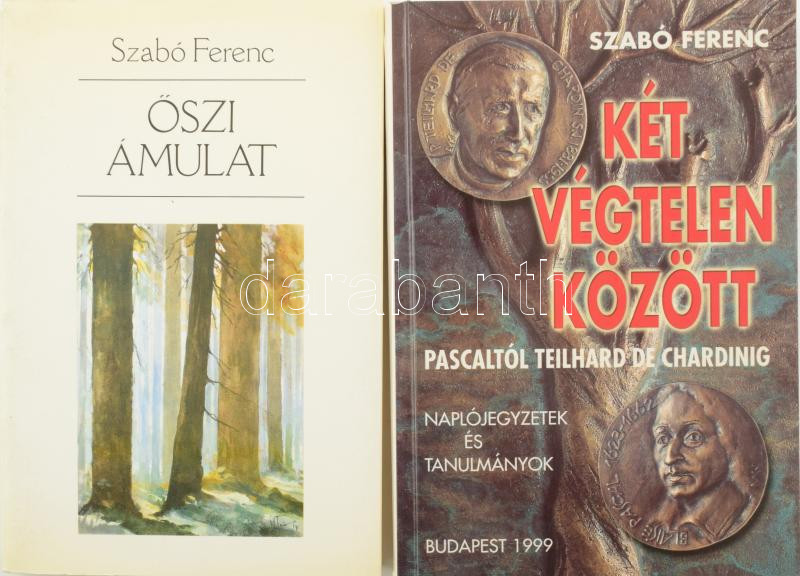 Szabó Ferenc S.J. két dedikált könyve: Őszi ámulat. Versek és műfordítások. Róma, 1982, magánkiadás. Első kiadás. Kiadói papírkötés. + Két végtelen között. Naplójegyzetek és tanulmányok. Kecskemét-Bp., 1999, Korda - Távlatok. Első kiadás. Kiadói papírkötés. Mindkét kötet a szerző, Szabó Ferenc (1931-2022) jezsuita szerzetes, teológus, költő, publicista által dedikált.