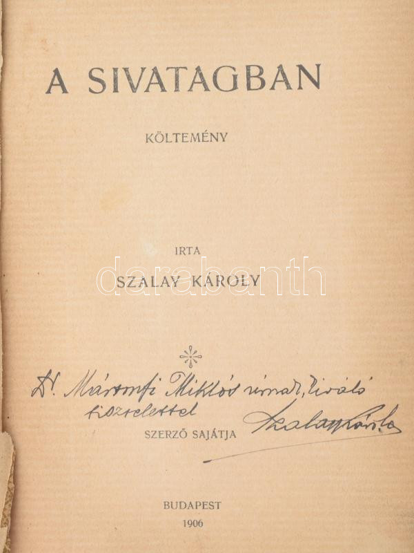 Szalay Károly: A sivatagban. Költemény. (Dedikált!) Bp., 1906, szerzői kiadás (Károlyi György-ny.), 139+(5) p. Első kiadás. A borító Prenoszil Sándor munkája. Kiadói illusztrált egészvászon-kötés, aranyozott lapélekkel, viseltes borítóval, kissé vetemedett kötéstáblákkal, kissé dohos, néhány lap kissé koszos. A szerző, Szalay Károly (1859-1938) író, műfordító által dedikált példány.