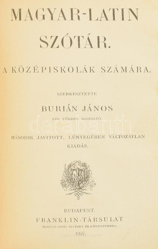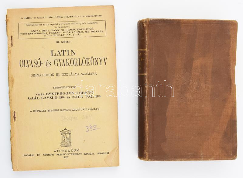Magyar-latin szótár a középiskolák számára. Szerk.: Burián János. Bp.,1907, Franklin-Társulat, 524+(2) p. Második kiadás. Kiadói egészvászon-kötés, ázott, kissé deformált borítóval, lapszéli ázásnyomokkal. + Latin olvasó- és gyakorlókönyv a gimnáziumok III. osztálya számára. Szerk.: Esztergomy Ferenc, Gaál László, Nagy Pál. Szegedi Kovács Ágoston rajzaival. Bp., 1937, Athenaeum, 135+(1) p. Kiadói tűzött papírkötés, sérült, a hátsó borító különvált.