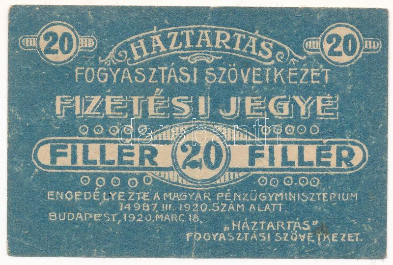 Budapest 1920. 20f "Háztartás Fogyasztási Szövetkezet fizetési jegye" pénztárjegye T:F