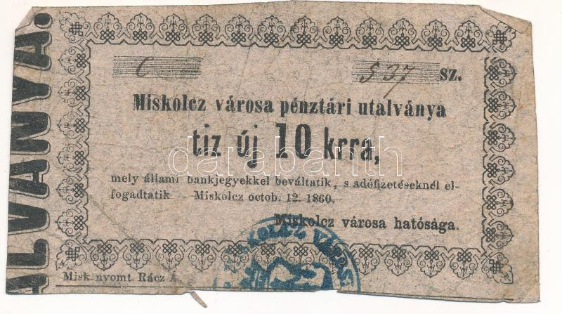Miskolc 1860. 10kr "Miskolcz város utalványa" bélyegzéssel T...
