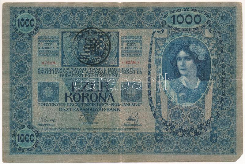 1902. 1000K fekete "ROMANIA TIMBRU SPECIAL" román felülbélye... https://www.darabanth.com/en/473-Online-auction/473.0/Numismatics/Hungarian-Banknotes~1500008/1902-1000K-fekete-ROMANIA-TIMBRU-SPECIAL-roman-felulbelyegzessel-TF-VG-kis-beszakadasok-eg~II3202728