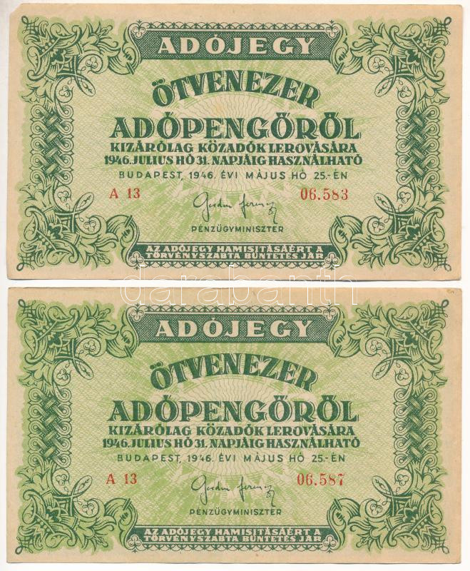 1946. 50.000AP (2x) közeli sorszámok "A 13 06.583 - A 13 06.587&q...