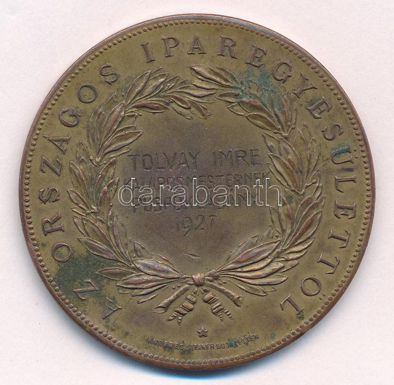 Description: Anton Scharff (1845-1930) 1927. "Az Országos Iparegyesülettől - Tolvay Imre kalaposmesternek, Püspökladány 1927" aranyozott bronz emlékérem "Knopp és Steiner Budapesten" gyártói jelzéssel (54mm) T:XF kopott aranyozás, ph, patina