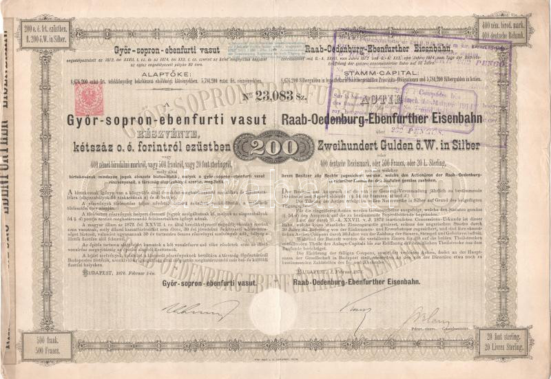 Description: Budapest 1876. "Győr-sopron-ebenfurti vasut" részvénye 200Ft-ról, magyar és német nyelven, szárazpecséttel, bélyegzésekkel és szelvényekkel T:F hajtás mentén kettészakadva
