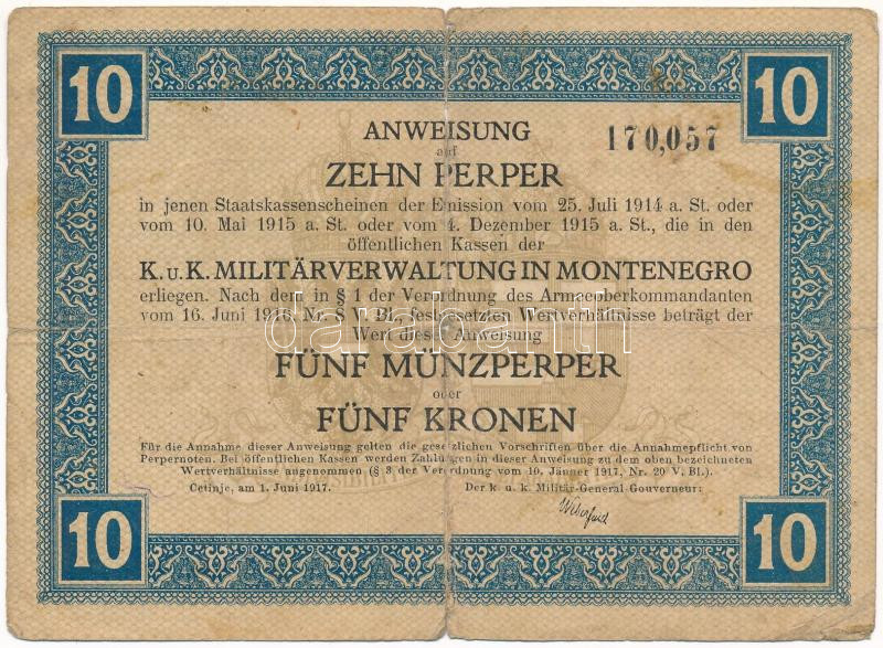 Montenegro / Austro-Hungarian Military Administration 1917. 10 Perper C:VG tear, spot