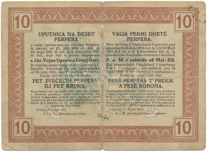 Montenegró / Császári és Királyi Katonai Közigazgatás 1917. 10P T:VG s... https://www.darabanth.com/en/473-Online-auction/473.0/Numismatics/Worldwide-banknotes~1500015/Montenegro-Csaszari-es-Kiralyi-Katonai-Kozigazgatas-1917-10P-T-VG-szakadas-foltMontenegro-~II3207739