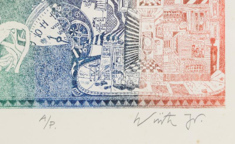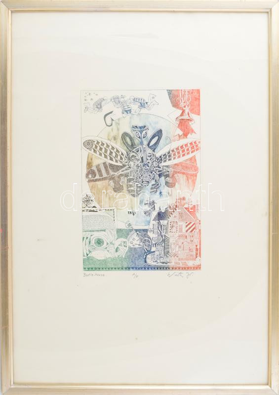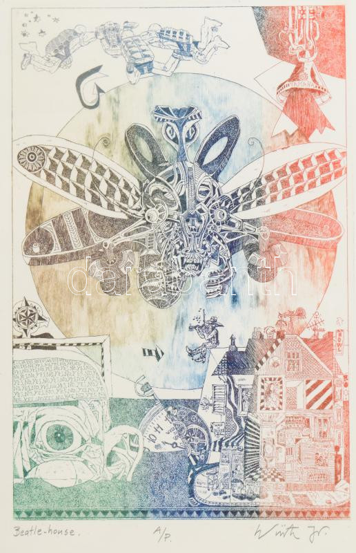 Ifj. Würtz Ádám (1957-): Beatle House. Színezett rézkarc, papír, jelze...