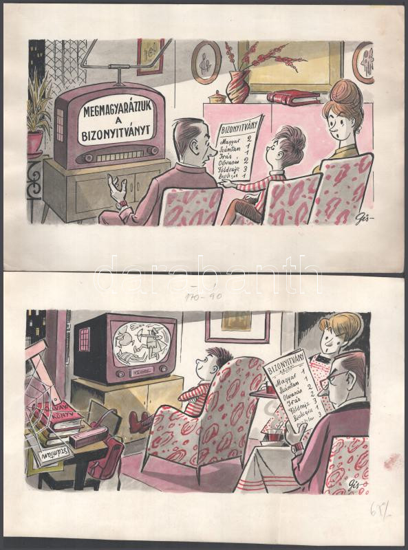 Szegő Gizi (1902-1985): Megmagyarázzuk a bizonyítványt (2 lapból álló ... https://www.darabanth.com/en/473-Online-auction/473.0/Paintings-and-graphics/Paintings-and-graphics~500003/Szego-Gizi-1902-1985-Megmagyarazzuk-a-bizonyitvanyt-2-lapbol-allo-karikatura-Vegyes-te~II3200786