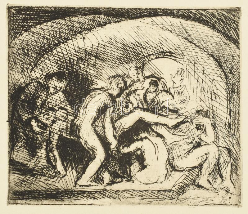 Szőnyi István (1894-1960): Sírbatétel. Rézkarc, papír, jelzett a karcon, hátoldalán Palota Galéria bélyegzőjével, 7,5×8,5 cm