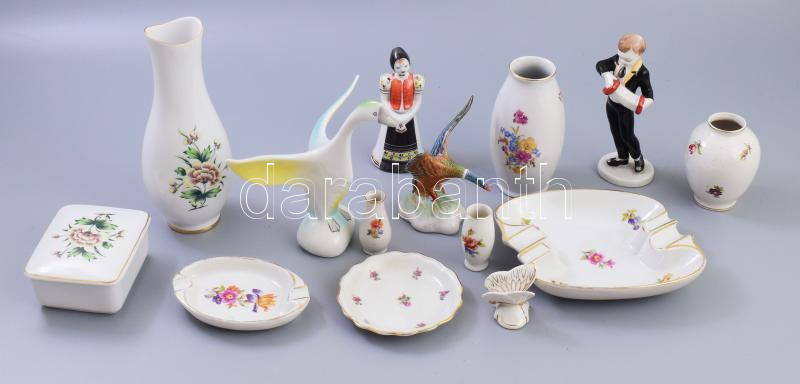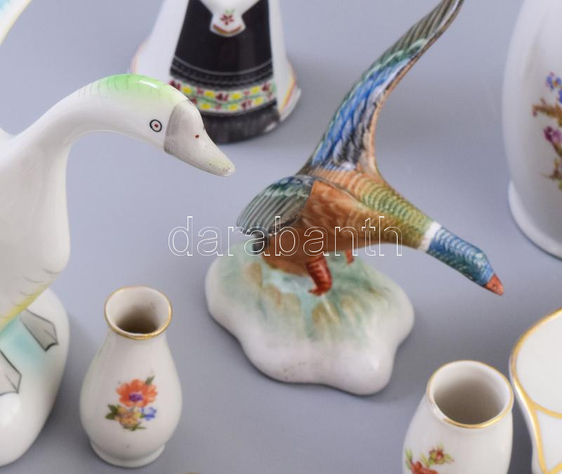 14 darabos nagyrészt Hollóházi tétel, közte harmonikás, matyó lány, liba figurák, bonbonierek, tálkák, vázák.