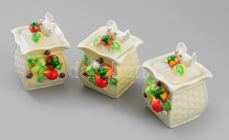 3 db Casa nova porcelán fűszeres, konyhai edény plasztikus gyümölcs mintákkal m: 12 cm