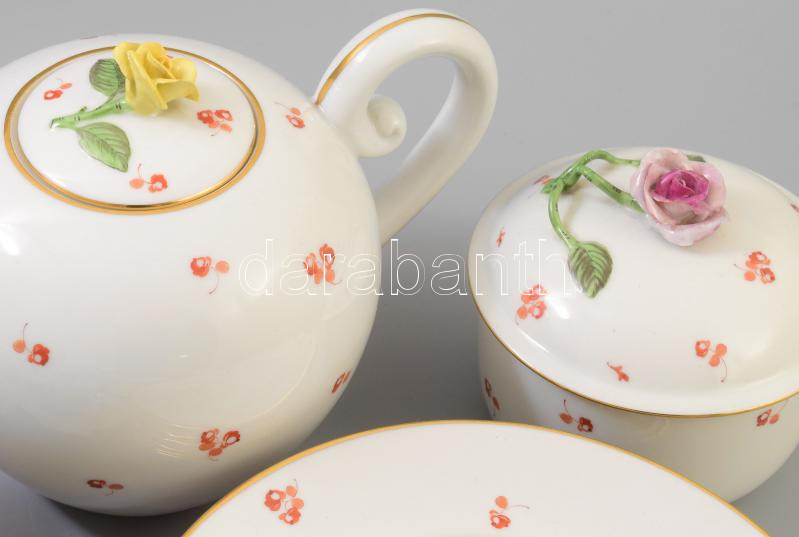 Herendi apró pirosvirágos kávés készlet, desszertes tányérokkal. cca 1920/30, fedeleken rózsa fogókkal, jelzett, teljes, egyik csészén repedéssel.