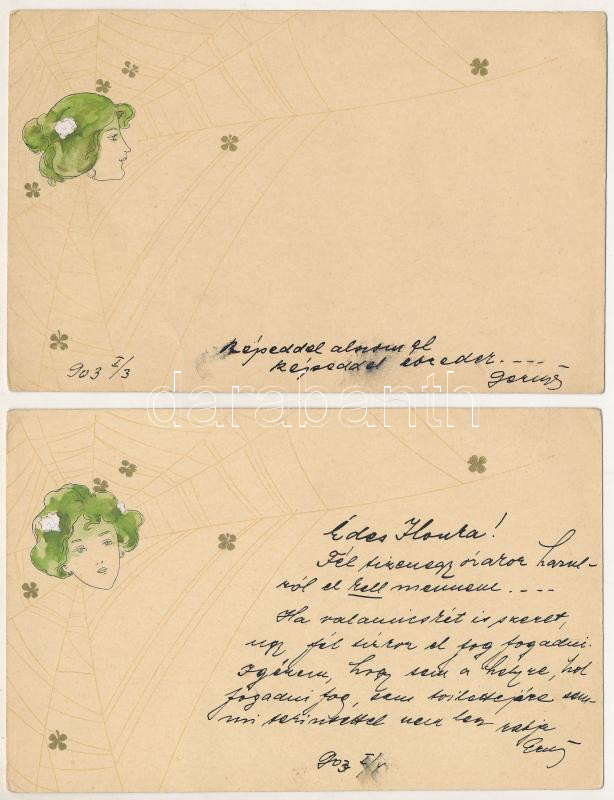 1903 Hölgy feje pókhálóban - 2 db nem képeslap hátoldalú litho művészl...