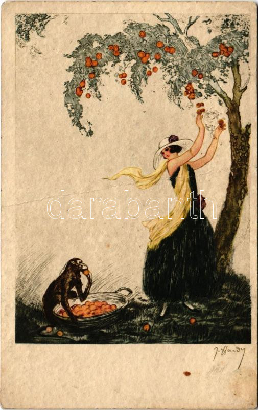 Lady art postcard with monkey. Italien Gravur 1964. s: J. Hardy (fa)