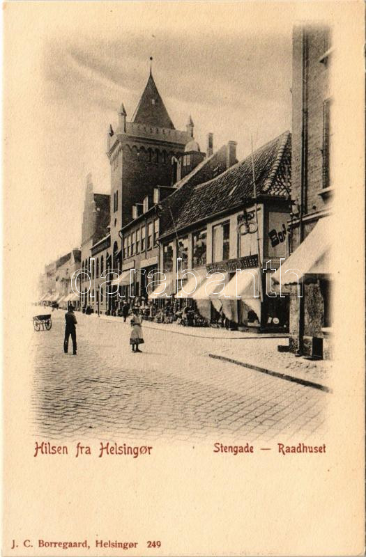 Helsingor, Helsingör; Stengade, Raadhuset / street view, town hall, shops