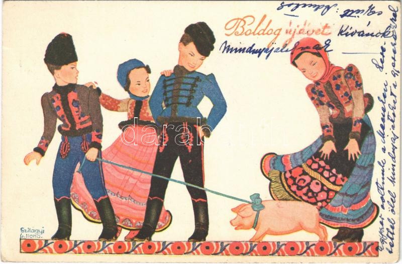 Description: Boldog Újévet! Magyar folklór művészlap / Hungarian folklore art postcard with New Year greeting and pig s: Szilágyi G. Ilona (felületi sérülés / surface damage)