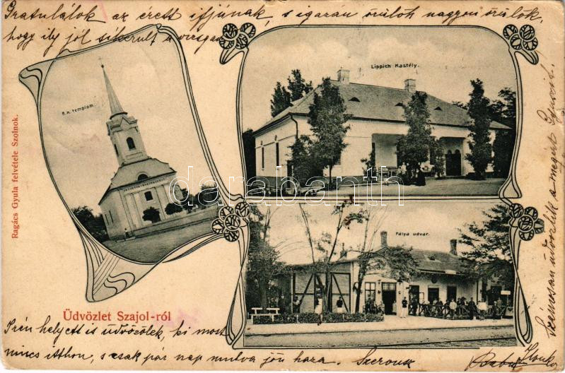 Description: 1903 Szajol (Alföld), Római katolikus templom, pályaudvar., régi vasútállomás, Lippich Gusztáv vármegyei főispán kastélya. Ragács Gyula felvétele Szolnok, Art Nouveau (EK)
