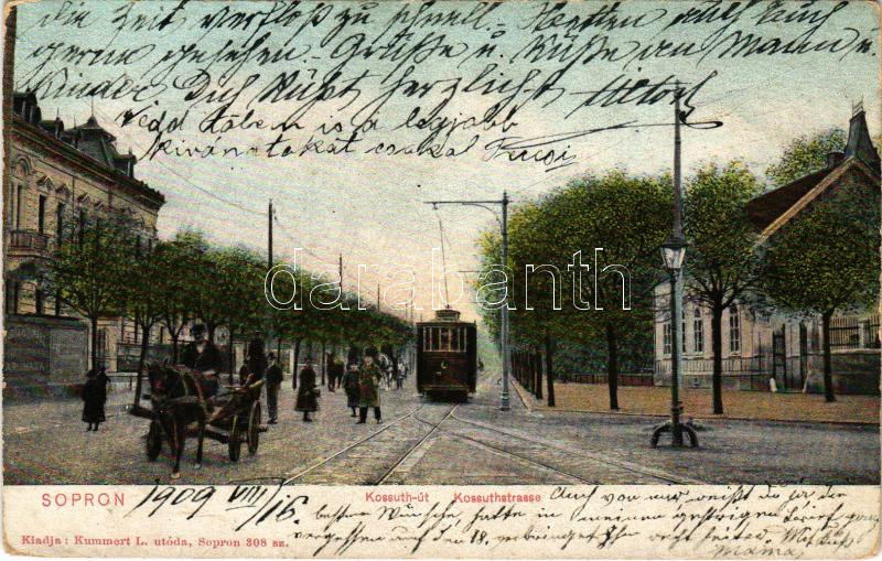 1909 Sopron, Kossuth út, villamos, lovaskocsi. Kummert L. utóda kiadása (Rb)