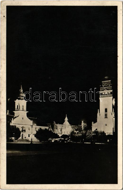 Nagykőrös, a kivilágított városháza a református templommal és tanítók...