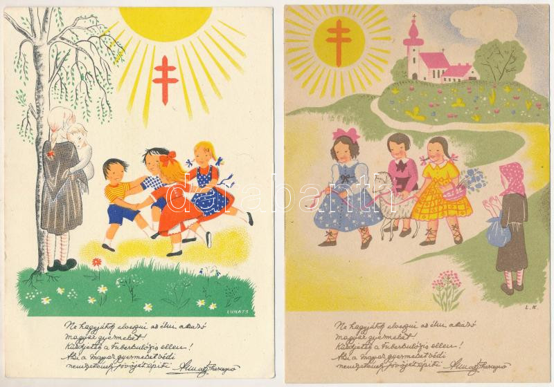 Description: Tuberkulózis elleni küzdelem - nemzetvédelem! Levelezzünk a Tuberkulózis Elleni Országos Szövetség propaganda osztálya által forgalomba hozott "TEOSZ" levelezőlapokon, mert ezzel a tuberkulózis elleni küzdelmet támogatjuk! / Hungarian propaganda, national organization's charity fund for the fight against tuberculosis - 2 db propaganda képeslap Lukáts szignóval