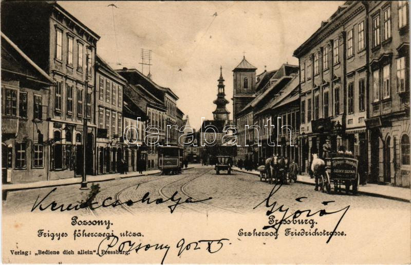 1902 Pozsony, Pressburg, Bratislava; Frigyes főherceg utca, villamos, Tafelmayer és Weischek szikvízgyár lovaskocsija. Verlag Bediene dich allein / Erzherzog Friedrichstrasse / street, tram, shops, horse-drawn carriage (fl)