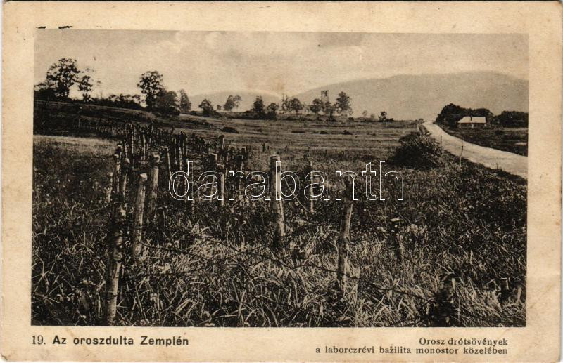 Description: Laborcrév, Krasznibród, Krásny Brod (Mezőlaborc, Medzilaborce, Möze Laborcz); Az oroszdúlta Zemplén 19., orosz drótsövények a Bazilita monostor közelében. Varga Bertalan kiadása / WWI Russian wire fences near of the Basilian monastery after the Russian's destruction (ázott / wet damage)