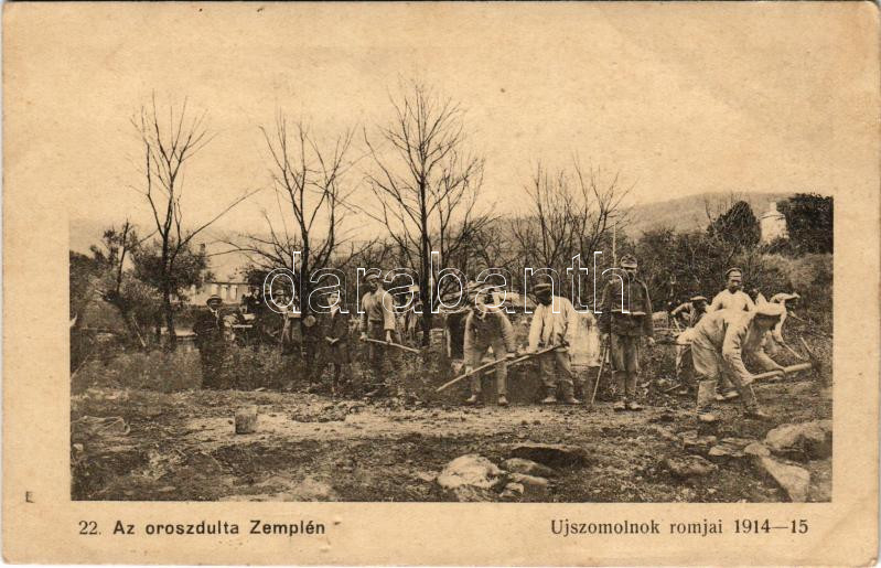Description: Újszomolnok, Szmolnik, Smolník (Takcsány, Stakcín); Az oroszdúlta Zemplén 22., orosz hadifoglyok munkában a romok között 1914-15. Varga Bertalan kiadása / WWI Russian POWs at work after their attack (ázott sarok / wet corner)