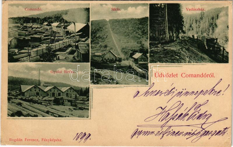1899 (Vorläufer) Komandó, Kommandó, Comando, Comandau; fűrésztelep, sikló, vadászház, Gyulai fűrész, iparvasút. Bogdán Ferenc kiadása / sawmill, hunting house, funicular, industrial railway