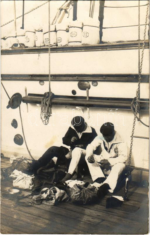 Description: 1916 K.u.k. Kriegsmarine Effektenreinigung, S.M. Dampfer IV (ex Gastein), Matrosen an Deck / Osztrák-magyar matrózok a fedélzeten / WWI Austro-Hungarian Navy mariners on board. Alois Beer