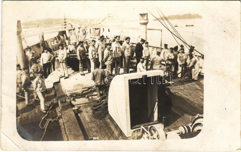 Description: 1916 K.u.k. Kriegsmarine Effektenreinigung, S.M. Dampfer IV (ex Gastein), Matrosen an Deck / Osztrák-magyar matrózok a fedélzeten / WWI Austro-Hungarian Navy mariners on board. photo (EK)