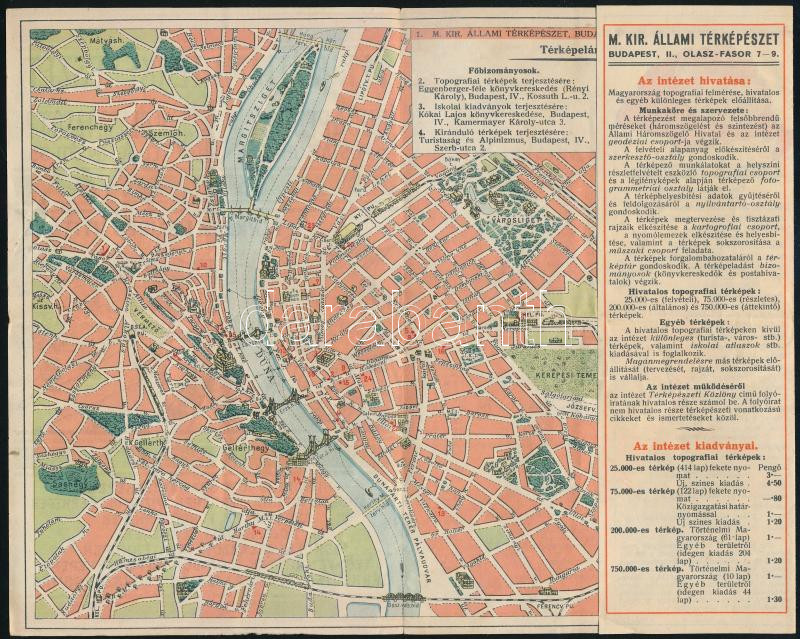 1931 A M. Kir. Állami Térképészet színes reklámprospektusa, a budapesti árusítóhelyek térképével, kiadványok árjegyzékével, kihajtva: 28x18 cm