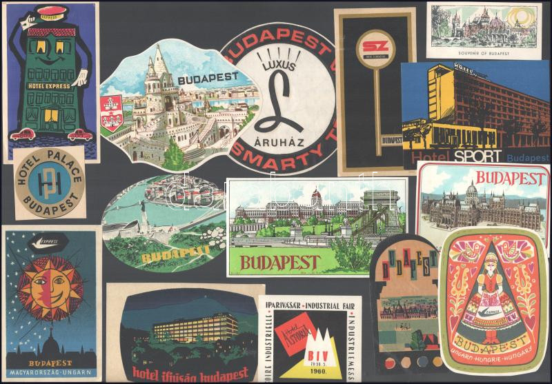Budapest, 15 db retró hotelcímke, bőröndcímke