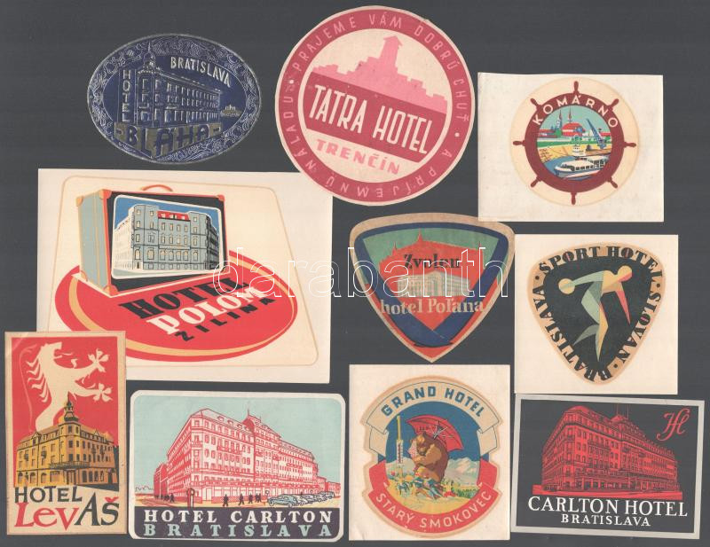Szlovákia (Felvidék), 10 db hotelcímke, bőröndcímke (Pozsony, Komárom, Ótátrafüred, stb.) / Slovakian luggage labels, 10 pcs (Bratislava, Komárno, Starý Smokovec, etc.)