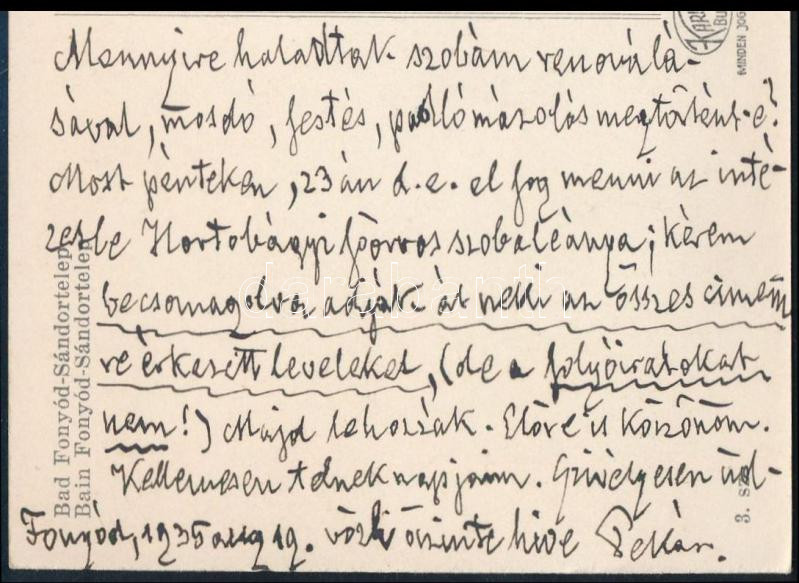 Pekár Mihály (1871-1942) orvos, egyetemi tanár, felsőház tagja saját kézzel írt és aláírt levelezőlapja dr. Bainter Gézának, szép állapotban