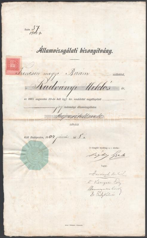 https://www.darabanth.com/en/474-Online-auction/474.0/Art-and-other-collectibles/Documents~500020/1904-Allamvizsgalati-bizonyitvany-Radvanyi-Miklos-trencseni-leveltaros-reszere-ot-alairassal~II3215640