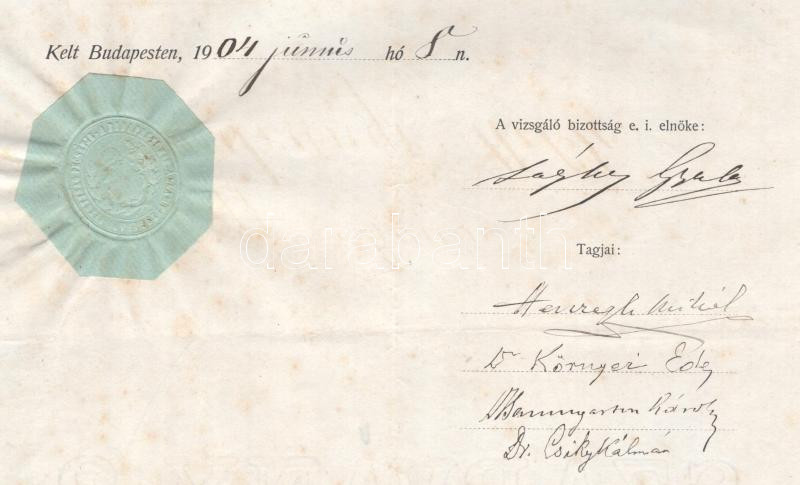 1904 Államvizsgálati bizonyítvány Radványi Miklós trencséni levéltáros részére, öt aláírással