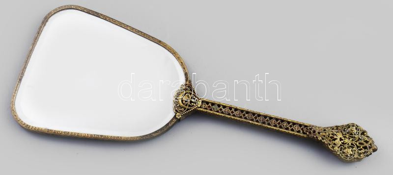 Antik kézi tükör, filigrán fogóval, korrodált, h: 31 cm
