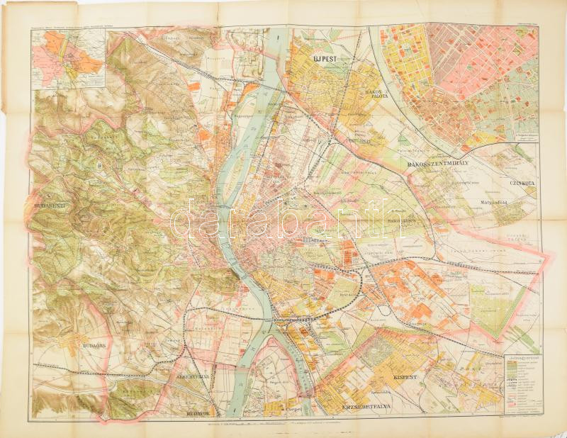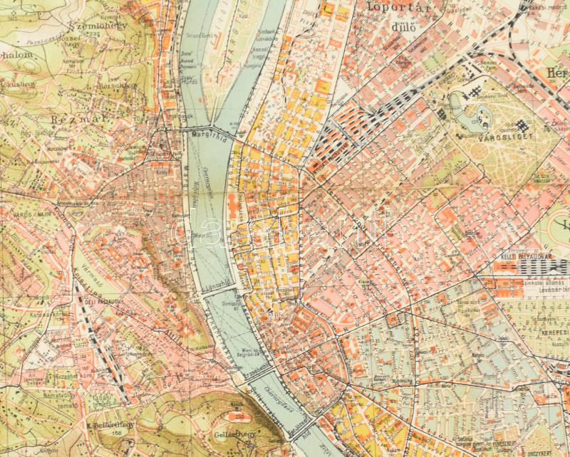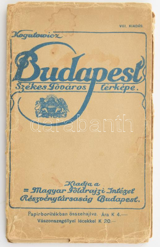 1919 Kogutowicz Manó: Budapest székesfőváros térképe, VIII. kiadás, 1:25.000, Bp., Magyar Földrajzi Intézet Rt.,az eredeti papírboríték meg van, de leszakadt, foltos, a térkép szakadt, 32 p., 79x94 cm.
