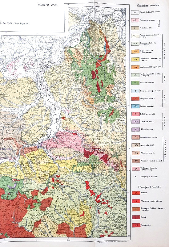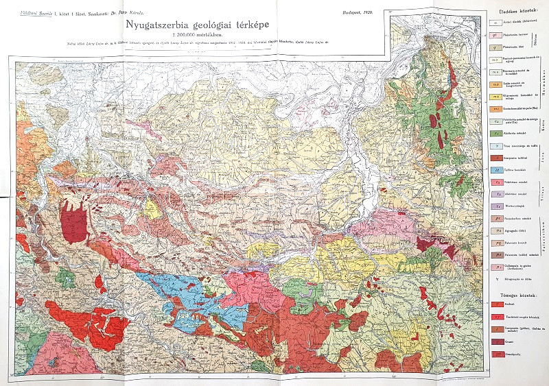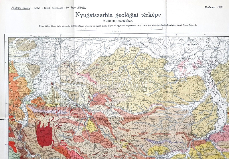 [Térkép] Nyugatszerbia geológiai térképe. Néhai idősb Lóczy Lajos és ifjabb Lóczy Lajos 1917-1918. évi felvételei alapján készítette ifjabb Lóczy Lajos. Mértéke: 1 : 200,000. Budapest, 1920. Klösz György és Fia Térképészeti Műintézete. Színes térkép, mérete: 490x640 mm egy 540x760 mm méretű térképlapon. Az első világháború idején, a Magyar Tudományos Akadémia és a Földtani Intézet megbízásából, Károlyi Lajosné Széchenyi Hanna támogatásával egy népesebb kutatócsapat indult a délszláv régió közép-balkáni vidékének geológiai felmérésére. Az 1917-1919-ben lezajlott expedíció a Belgrádtól délnyugatra elhelyezkedő térség földtani térképezését célozta. A döntően hegyvidéki területen ma Bosznia-Hercegovina legkeletibb és Szerbia legnyugatabbi részei osztoznak, határukat ma a rendkívüli kanyarokat leíró Drina folyó jelöli ki. Térképünk északi határát a Bileljina-Szabács-Belgrád vonal jelenti (Bijeljina bosnyák területen áll), nyugati határán bosnyák városok sorakoznak: Bijeljina, Janja, Zvornik a Drina folyóvölgyében, majd a déli hegyek közt Nova Kaszaba és Srebrenica. Térképünk déli határán a Drina beszögellésétől a közép-szerbiai Gornji Milanovacig terjedő hegyvidék, keleti határán pedig Gronji Milanovactól Belgrádig húzódó vonal. Színkódolt geológiai térképünkön hegy- és vízrajzi, közlekedés- és településhálózati részletek, a színes jelmagyarázat jobb oldalon. Példányunk bal szélén, a középső hajtás mentén apró szakadásnyom. Térképünk megjelent a Földtani Szemle I. kötetének 1. füzetében. Jó állapotú lap, hajtogatva.