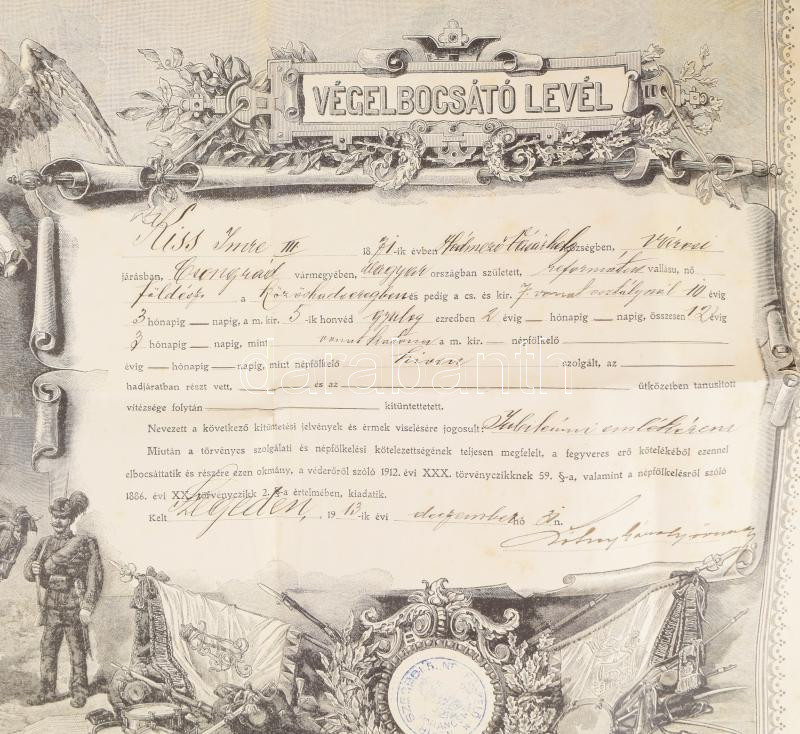 1913 Katonai végelbocsájtó levél a 7. vonat osztálynál szolgált katona...