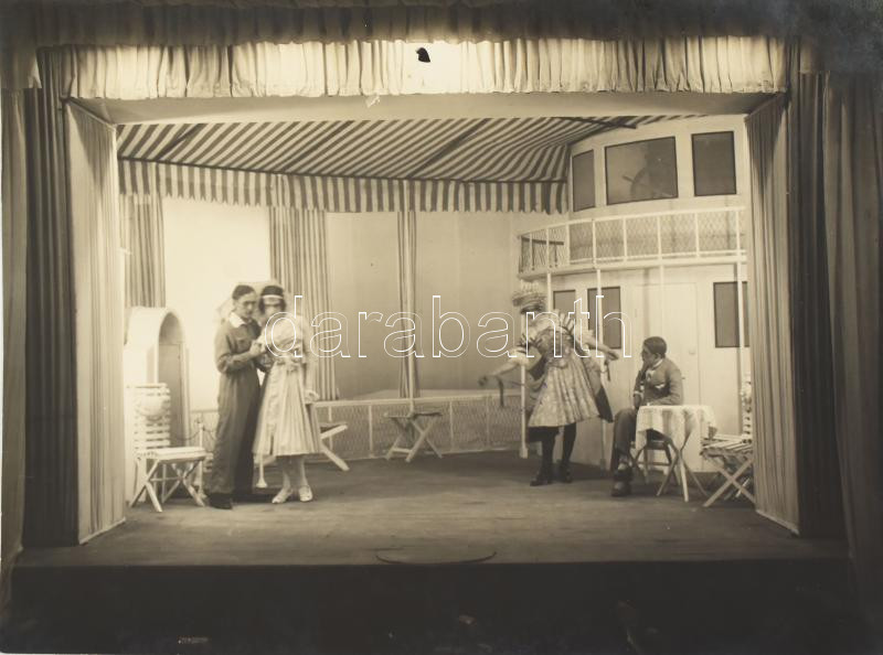 Description: 1919 Stobbe Kálmán (1883-1936) építőmester, díszlettervező, labdarúgó, a magyar válogatott edzője pecséttel jelzett fotója, a Krasznaja Recska, Rjecska, Krasnaia- Rjetschka (Vladivostok) hadifogoly tárborban tartott magyar színházi előadás (Leányvásár);. feliratozott / Hungarian play in the Krasnaia- Rjetschka (Vladivostok) Japanese-Russian POW (prisoner of war) camp. photo 15x11 cm