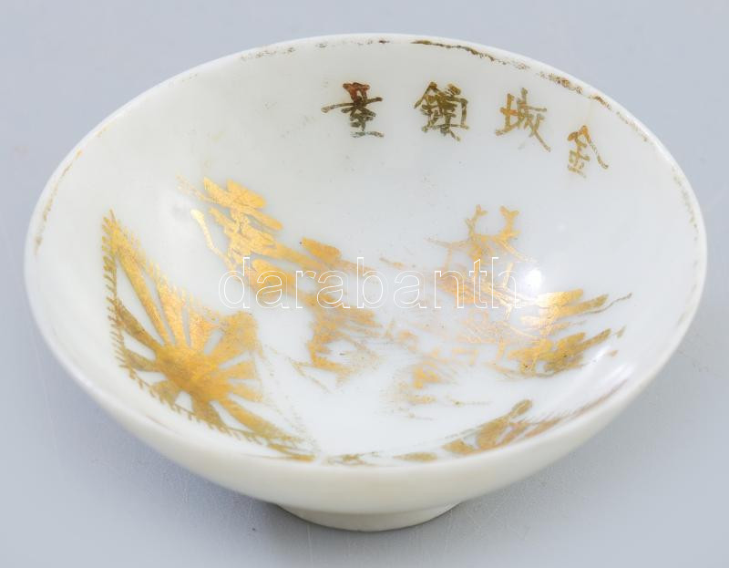 Japán porcelán katonai szakés csésze. cca 1940-1944, Kanazawa Helyőrség, páros zászló és kastély díszítésekkel, kissé kopott aranyozással, d: 6,5 cm