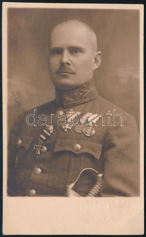 cca 1920-1930 Az I. világháborút megjárt magyar katonatiszt portréja, szablyával, német Vaskereszttel, ill. hazai kitüntetésekkel (Katonai Érdemkereszt III. osztálya hadidíszítménnyel és kardokkal, Károly-csapatkereszt, Katonai Jubileumi Kereszt); fotólap Ábrahám István miskolci műterméből, sarkán kis törésnyommal, 13,5x8 cm