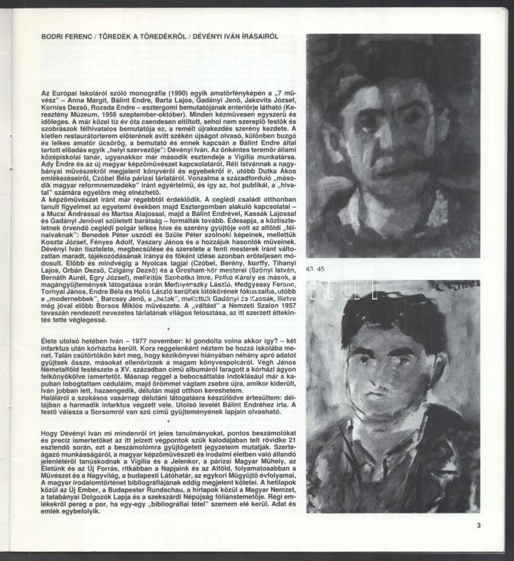 20. századi magyar művészet Dévényi Iván gyűjteményéből. Szerk.: Csaplár Ferenc. Kassák Múzeum: Budapest, 1993. 22p. Fekete-fehér képekkel, többek közt Anna Margit, Barcsay Jenő, Bálint Endre, Csontváry-Kosztka Tivadar, Czóbel Béla, Gulácsy Lajos, Kassák Lajos, Kondor Béla, Korniss Dezső műveinek reprodukcióival illusztrált katalógus. Kiadói papírkötésben.