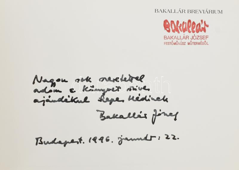 Bakallár Breviárium. A szerző, Bakallár József (1940-2013) festőművész... https://www.darabanth.com/en/474-Online-auction/474.0/Books/Books-Architecture-Art~1000003/Bakallar-Breviarium-A-szerzo-Bakallar-Jozsef-1940-2013-festomuvesz-altal-DEDIKALT-peldany~II3219095