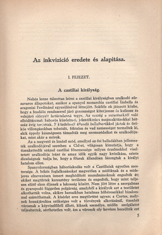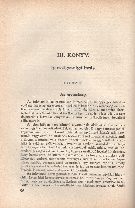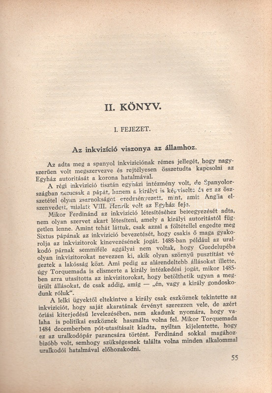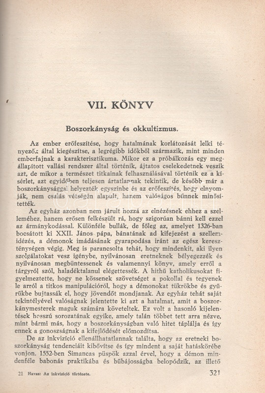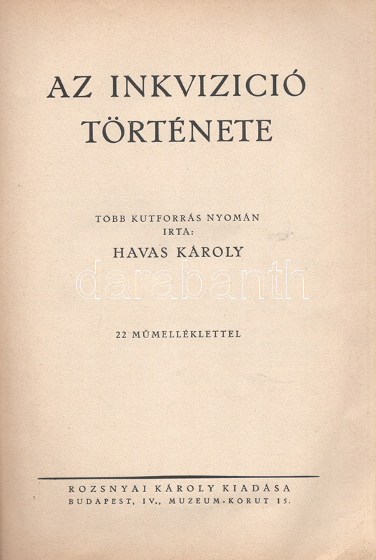 Havas Károly: Az inkvizíció története. Több kútforrás nyomán írta: Havas Károly. 22 műmelléklettel. Budapest, (1927). Rozsnyai Károly kiadása (Fővárosi Nyomda Rt.) 504 p. + 22 t. (Brenner Nándor illusztrációi). Első kiadás. Korabeli sajtóértesülések szerint a Havas Károly (1877-1944) újságíró neve alatt megjelent kötet megjelenését megelőzően vidéki nagyvárosokban és falvakban intenzív ügynöki kampány zajlott, melynek eredményeképpen a tízezer példányban nyomott kötet első kiadása rendkívül hamar elfogyott. A szenzációs témát Brenner Nándor - olykor némi erotikát sem nélkülöző - festményei kísérik. A munka utóéletéhez hozzátartozik a mű plágiumpere, a munka ugyanis Henry Charles Lea századfordulón megjelent kötetének bővebb kivonatolása, az eredeti szerző nevének érdemi megjelenítése nélkül. (Esti Kurír, 1928. március 28.) Aranyozott, álbordázott kiadói egészvászon kötésben, a gerincen apró foltossággal, felül színes festésű lapszélekkel. Jó példány.